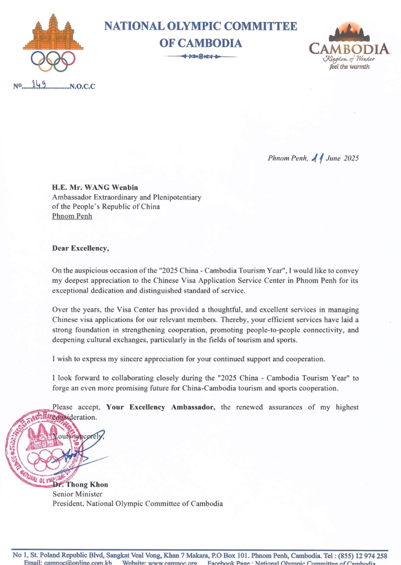 柬埔寨國家奧林匹克委員會在信中表示,長期以來,柬埔寨簽證中心在管理中國簽證申請方面為相關(guān)人員提供了周到、優(yōu)質(zhì)的服務(wù),為加強中柬合作,促進(jìn)人文交流,尤其對旅游和體育領(lǐng)域的文化交流奠定了堅實的基礎(chǔ)。期待在“2025年中國-柬埔寨旅游年”期間緊密合作,為中柬旅游及體育合作開創(chuàng)充滿希望的未來。