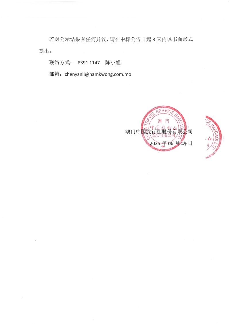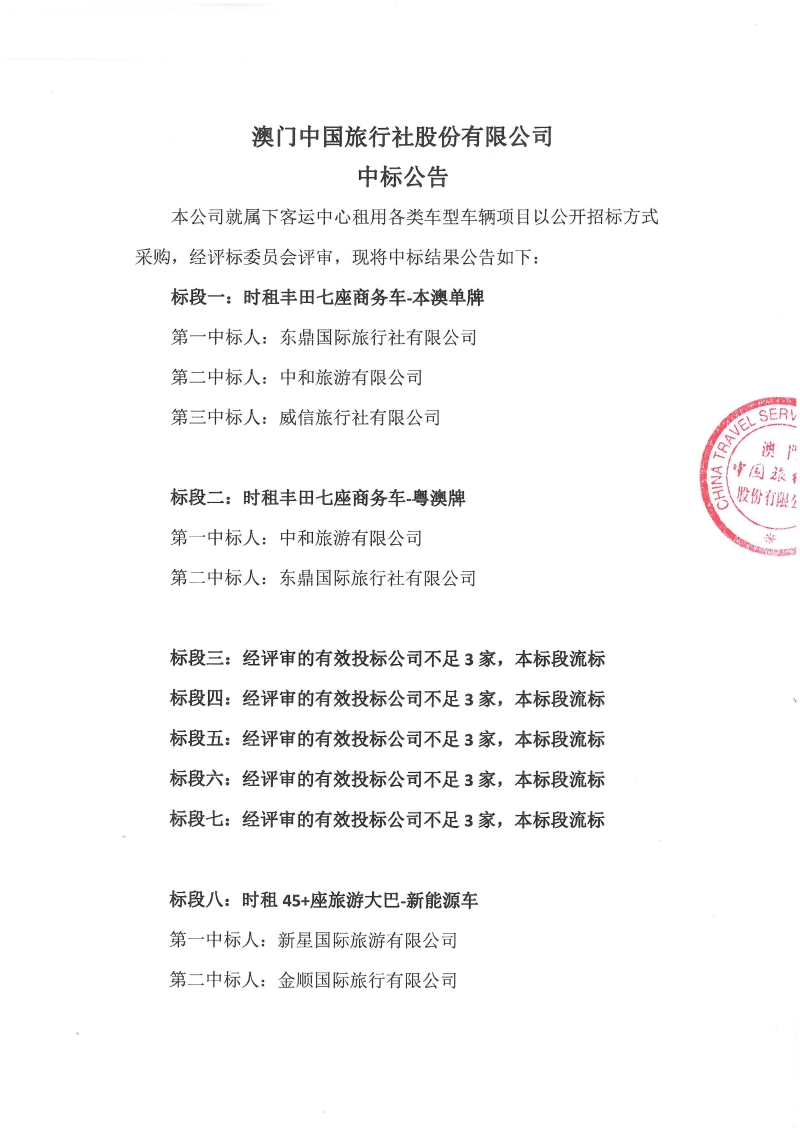 澳門中國旅行社股份有限公司租用各類車型車輛項目中標(biāo)公告