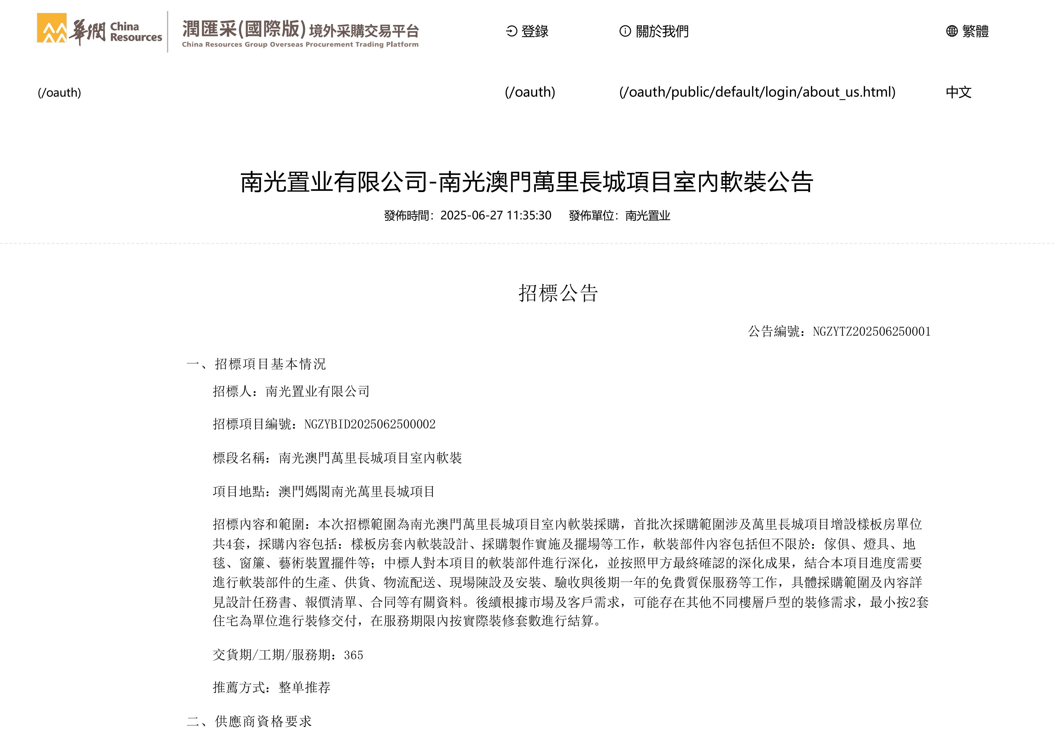 南光澳門萬里長城項(xiàng)目室內(nèi)軟裝招標(biāo)公告